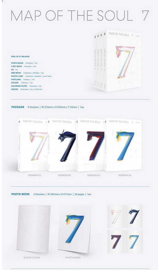 След глобалния успех на “MAP OF THE SOUL : PERSONA”, BTS се завръщат с още по-дълбок и смислен проект – “MAP OF THE SOUL : 7”, който отбелязва 7 години от дебюта им и силната им връзка със себе си, музиката и ARMY. Албумът включва 20 песни, комбиниращи поп, трап, R&B, електронна музика и корейски традиционни мотиви.