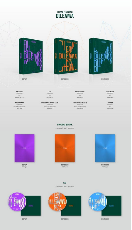 С “DIMENSION : DILEMMA”, ENHYPEN представят свят, в който младите хора се сблъскват с противоречиви ценности, изкушения и несигурност. Темата за „дилемата“ е изразена чрез смели звуци, синтпоп, хип-хоп и рок елементи – оформяйки албум, който е едновременно модерен и концептуален. Наличен в три версии: SCYLLA, ODYSSEUS, и CHARYBDIS. При "Random Ver." получавате една от тях на случаен принцип.