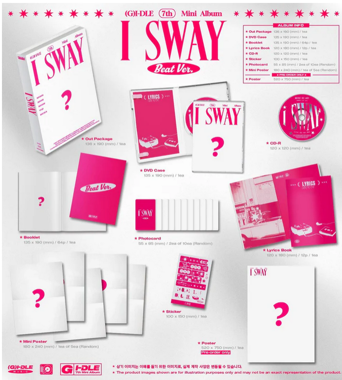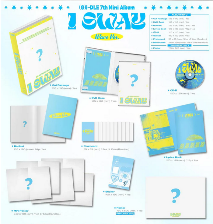 Хитовата момичешка група (G)I-DLE се завръща с новото си издание I SWAY, изпълнено с лятна енергия, освежаващи звуци и категорично женско присъствие. Версията Random Ver. включва една от няколко концептуални обложки, избрана на случаен принцип – перфектна за колекционери и верни фенове.