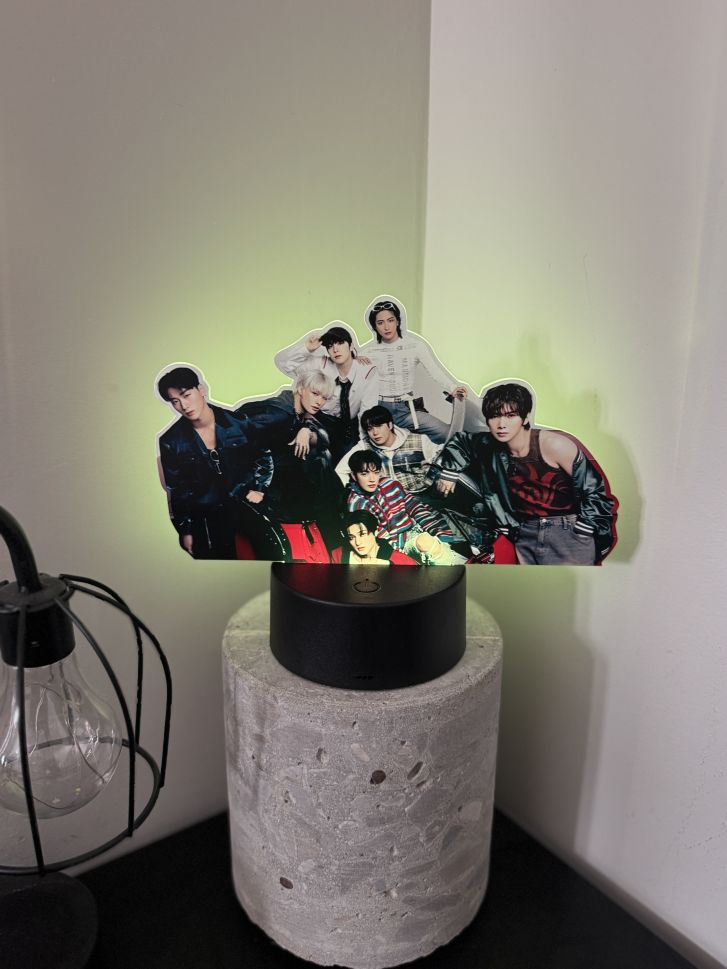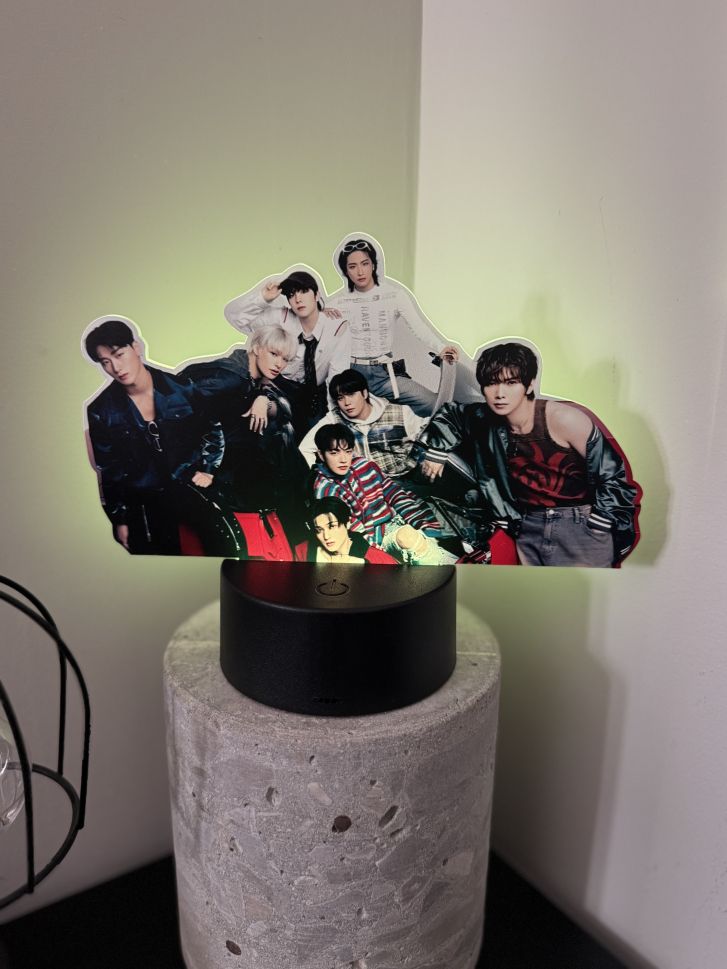 ATEEZ – Светеща декорация е официален K-pop аксесоар, идеален за фенове, които искат да добавят атмосфера, стил и настроение в стаята си. Декорацията е с LED осветление и носи емблематичното лого или визия, свързана с ATEEZ, което я прави отличен подарък или колекционерски елемент за всеки ATINY.