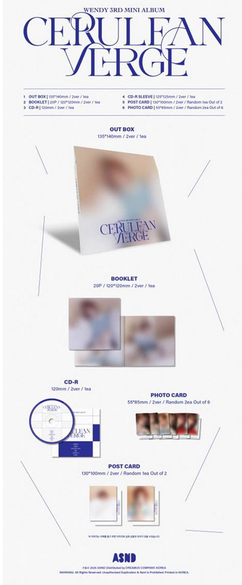 WENDY (Red Velvet) представя своя 3-ти мини албум „CERULEAN VERGE“ в компактната Digipack версия! Тази версия е налична в 2 различни дизайна (Random Ver.), като всяка включва специално подбрани снимки и екстри за феновете. Практичен, стилен и колекционерски албум, идеален за ReVeluv, които искат уникално издание от соло проектите на Уенди.