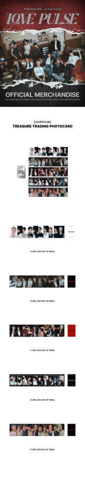 Официален TREASURE - [LOVEPULSE] Trading Photocard сет за колекционери и фенове. Перфектен начин да допълниш колекцията си с ексклузивни фотокарти от новия албум LOVE PULSE. Всеки пакет съдържа случайна карта с член на групата, което прави събирането още по-вълнуващо.