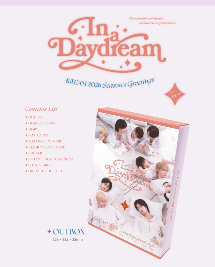 &TEAM – 2026 SEASON` GREETINGS 'In a Daydream', официално колекционерско издание, създадено за феновете на новата K-pop сензация &TEAM. Този сезонен сет включва календари, фотокниги, постери и специални фотокарти, представящи членовете на групата в уникални концепции и сцени, вдъхновени от „Daydream“ темата. &TEAM е мултинационална K-pop група, известна със свежия си стил, харизматични членове и динамични перформанси, която бързо завладява фенове по целия свят.