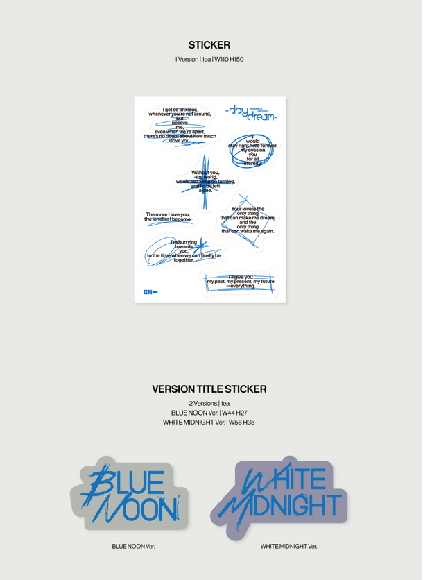 ENHYPEN се завръщат с дългоочаквания си проект ROMANCE : UNTOLD, който представя нова художествена посока и по-зрял образ на групата. Daydream Ver. изобразява нежна, мечтателна страна от тази концепция – перфектна за колекционери и фенове, които ценят визията и емоцията на групата.