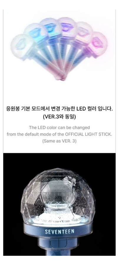 Официалният SEVENTEEN Light Stick Ver.3 – 10th Anniversary е лимитиран фенски продукт, създаден специално за отбелязването на десетата годишнина на групата. Светлинният стик предлага ярка LED светлина, множество режими на осветление и е идеален за концерти, събития и домашна колекция.